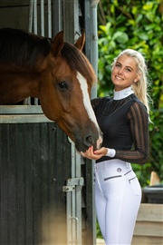 This airy, stretchable competition shirt has long sleeves made of breathable mesh. The mesh material features a stylish glitter stripe pattern and is also located at the front. The concealed zipper at the back, the silver stitching and the ANKY® logo on the stand-up collar finishes this shirt in a graceful way.